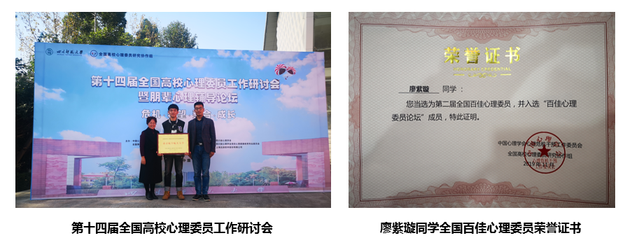 近日,第二届全国百佳心理委员论坛在四川师范大学举行,经面试和综合考虑,学校心理中心推荐jojo漫画 廖紫璇同学与能源与动力学院、民航/飞行学院等的两位同学参加全国评优。最终,三位同学从190名参赛者中脱颖而出,成功进入前一百名,荣获“第二届全国百佳心理委员”荣誉称号。