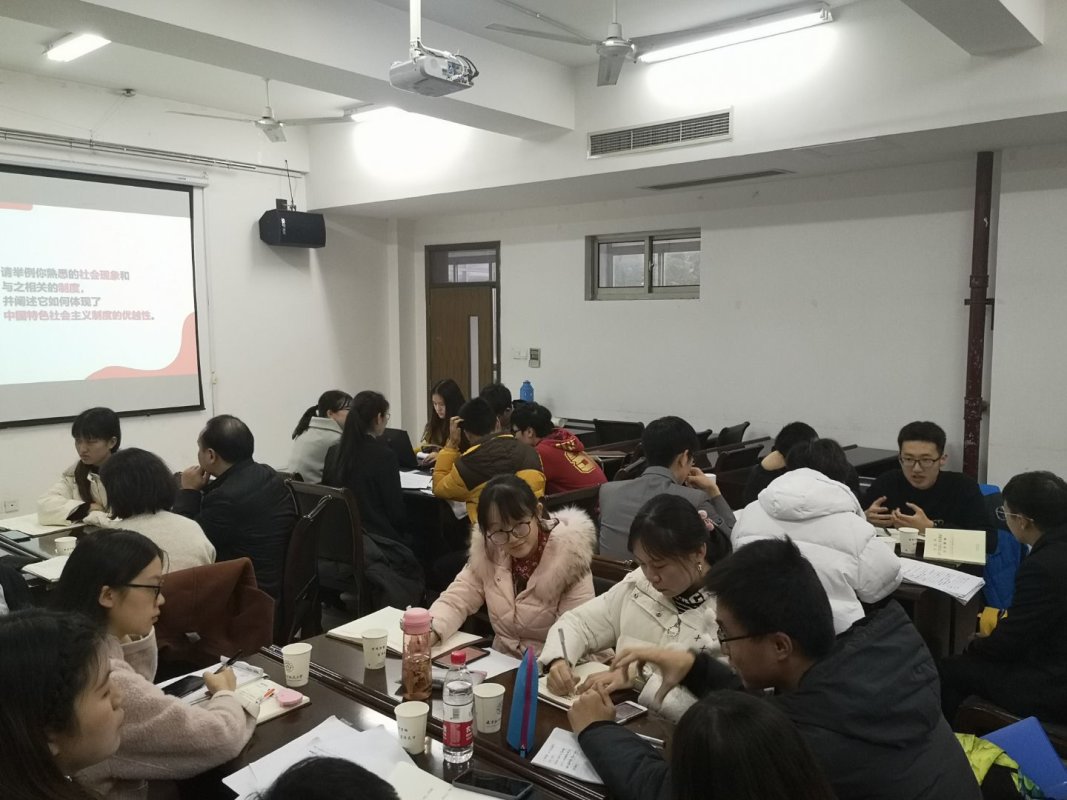 接下来,进入小组讨论环节。围绕“联系生活实际,阐述中国特色社会主义制度的优越性”的主题,四组成员开始了激励的讨论。有的成员从自己的母亲参加脱贫攻坚战的艰辛联系扶贫制度有改善民生的显著优势,有的成员从大兴国际机场这一“世界新七大奇迹之首”联系制度的集中力量办大事的显著优势,还有的从“双十一购物狂欢”的成交额中发现制度的不断解放和发展社会生产力的显著优势……邱禄芸对讨论发言进行总结,各种各样的显著优势归根到底都凝聚在十九届四中全会中的十三个“坚持”中。