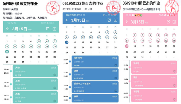 “每日番茄,材能飞跃”第一周期学习任务打卡即将落下帷幕,从每日的打卡公示中可以看到同学们对学习不松懈的严谨态度,很多同学每晚都保持至少两小时甚至两个半小时的学习时间。在这种“云集体”的学习氛围中,同学们相互监督,你追我赶,学习效率得到有效提高,自我控制能力大大增强。与此同时,大一年级也开展了课前线上签到的工作,各班学习委员于上课前十分钟在班群内发布签到任务,并每天公示出勤情况,以此督促每位同学及时进入课堂,有效避免迟到、旷课现象。