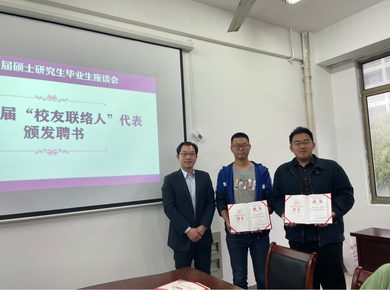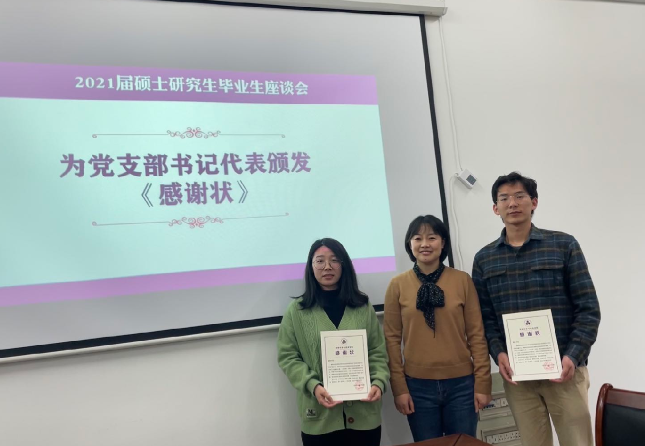 随后,占小红为优秀毕业生代表颁发了荣誉证书,祝愿他们在新的工作岗位继续发扬南航精神,保持初心,砥砺前行;许赞为党支部书记代表颁发了《感谢状》,感谢他们为支部、为学院做出的贡献;石勇为2021届“校友联络人”代表颁发聘书,希望他们不忘母校,常回家看看。
