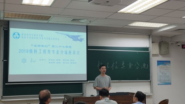 5月11日晚19:00,jojo漫画 “名师有约”第二十七期暨2019级核工程类专业分流座谈会于10107教室顺利召开。核科学与技术系主任常树全教授、核工程与核技术专业负责人贾文宝教授、辐射防护与核安全专业负责人张海黔教授、系教学副主任陈飞达副教授,2019级本科生辅导员张进鹏及2019级核工程类专业全体本科生参与了本次座谈会。
