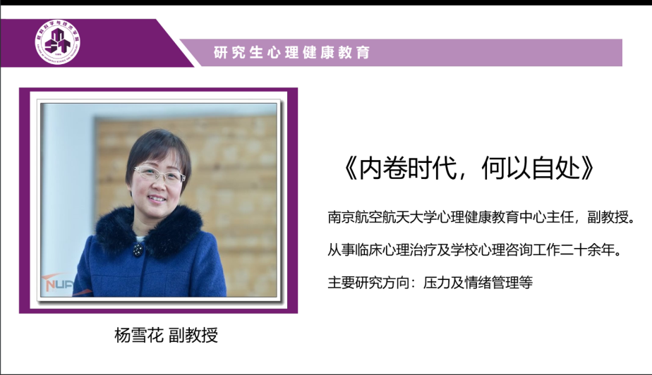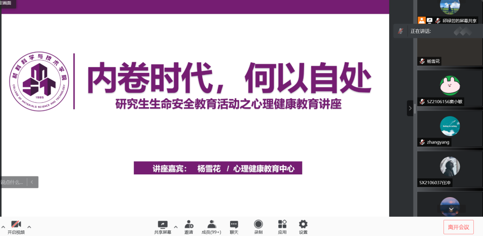为帮助研究生新生改善心理机能,培养良好的心理品质,塑造健全的人格,学院紧密结合研究生特点及研究生培养需求,综合考虑疫情防控常态化要求,于2021年12月20日晚,开展以“内卷时代,何以自处”为主题的心理健康教育讲座。讲座邀请jojo漫画 心理健康教育中心主任杨雪花任主讲嘉宾,2021级全体研究生参加。本次讲座由辅导员邱禄芸主持。