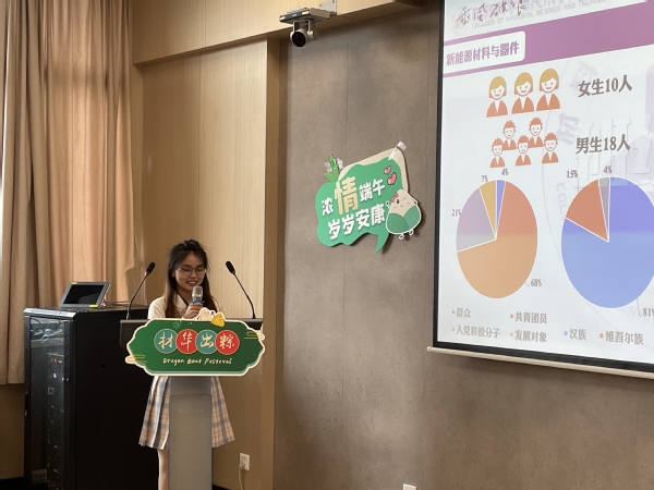 最后,黄志球为同学们送上了节日祝福,他指出,新能源材料与器件专业虽然是一个刚设立不久的专业,但随着国家实施“双碳”目标战略部署,新能源材料发展受重视程度不容小觑。他和同学们分享了端午的习俗,并寄语同学们三点希望,一是要热爱祖国,正如屈原对国家和人民的爱才流传了不朽的诗篇;二是要热爱中华传统文化,传统文化集聚了民族优秀的精神品质,要坚定文化自信;三是要热爱劳动,用双手创造美好生活,不负韶华,不负时代,不负期望。