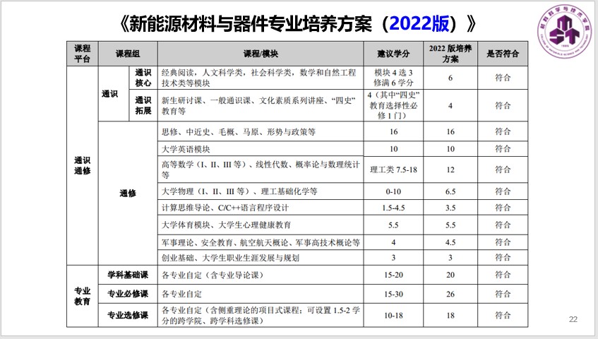 会议重点对2022级新能源材料与器件专业培养方案的修订进行了审议与讨论,秘书丁兵作为材料科学系教学主任,对照《jojo漫画 本科专业人才培养方案(2022版)制订指导意见》,分析了现有培养方案中课程平台、课程模块设置等方面的不足,重点介绍了2022版培养方案的修订方案。