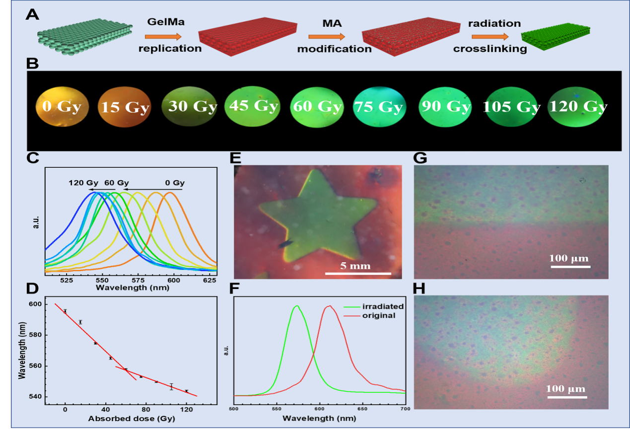 高能辐射不仅引起链断裂,而且能以较低的剂量引发高分子聚合物链的聚合和交联,而具有不饱和乙烯基的水凝胶材料响应更为灵敏。研究团队采用甲基丙烯酰化明胶(GelMA) 制备了水凝胶薄膜,并通过化学修饰再次引入不饱和乙烯基团,然后使用X射线对水凝胶进行照射。随着乙烯基在辐射过程中发生交联,反蛋白石水凝胶发生明显的收缩,并导致了水凝胶的颜色从红色向绿色移动。结果表明,在X射线照射下,反蛋白石水凝胶的反射峰波长位移与吸收剂量在0 Gy到60 Gy线性相关,检测灵敏度达到~0.61 nm/Gy。剂量继续增加时,由于水凝胶中双键的消耗,后续的交联反应变慢,因而其反射峰波长的移动速率也相应减小。为了检验该剂量计的分辨率,研究团队使用一个金属掩模遮挡X射线,形成一个五角星形的X射线束对薄膜进行辐照。从图4E中可以观察到,曝光后的剂量薄膜上有清晰的五角星形,该星型变色区域与金属掩模形状高度重合。光学显微镜照片表明,辐照变色区域与辐照区域之间界限清晰,其过渡区域宽度小于30 μm,表明该剂量计具有良好的空间分辨能力。同时,GelMa是一种众所周知的人体组织等效材料,因而这种光子晶体材料具有作为医用水凝胶辐射剂量计的巨大潜力。
