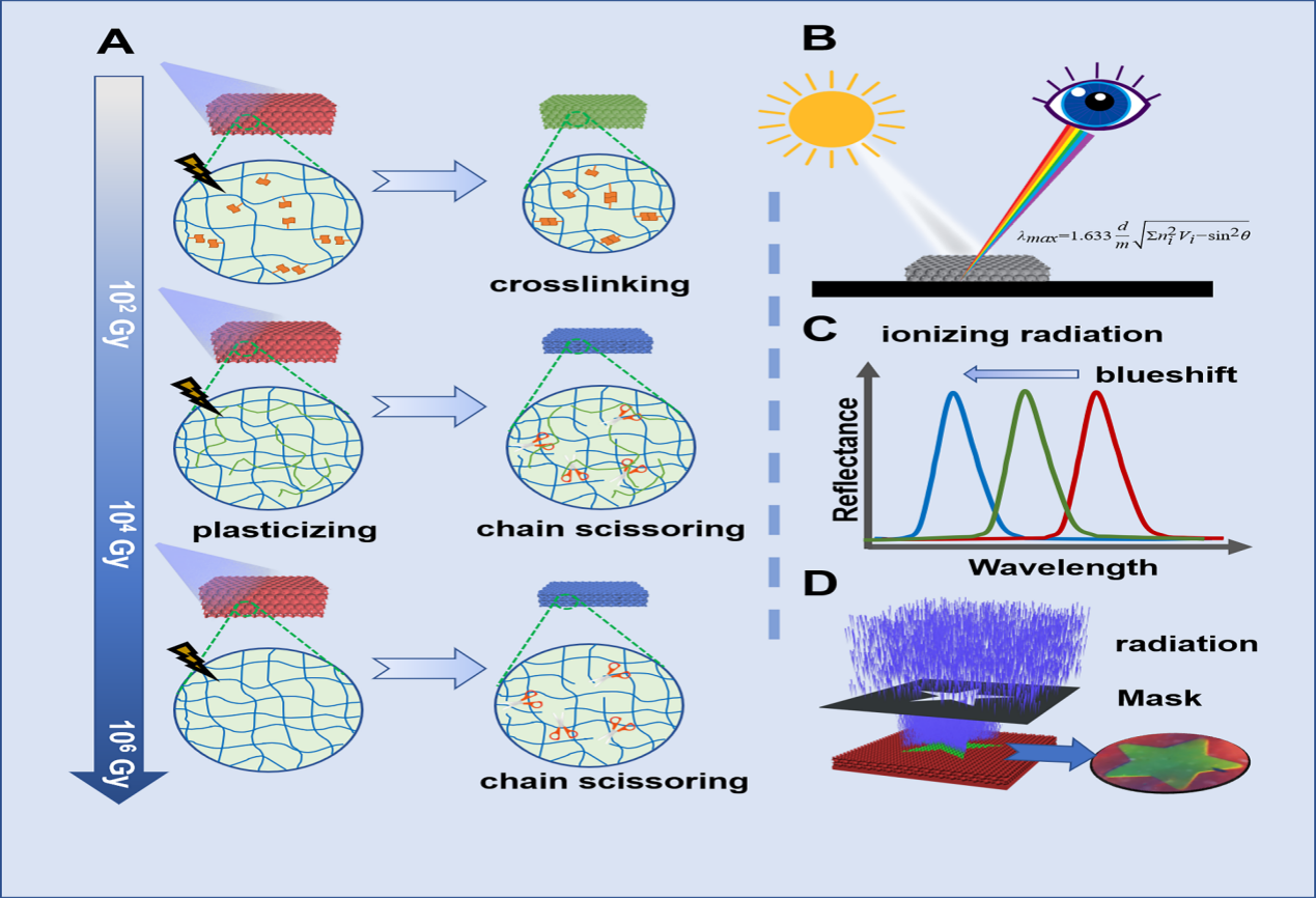近日,jojo漫画 王运龙博士、马骏教授,中国科学技术大学汪谟贞副教授,苏州大学王殳凹教授等合作在Cell Press细胞出版社期刊Matter在线发表了一篇题为“Color-phase Readout Radiochromic Photonic Crystal Dosimeter”的研究论文,提出一种基于光子晶体结构色变化的全新辐射剂量计概念,并采用多种光子晶体进行了概念验证,获得了不同灵敏度的剂量计,有望应用于辐射加工、大科学装置束流校准与放射医学剂量验证等领域。该论文jojo漫画 博士生王志浩为第一作者, 中国科学技术大学高分子科学与工程系博士生葛志青为共同第一作者,王运龙博士为通讯作者兼共同第一作者,马骏教授与王殳凹教授为共同通讯作者。