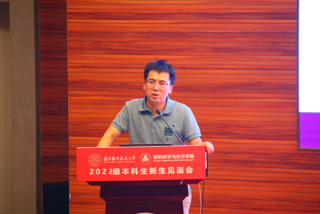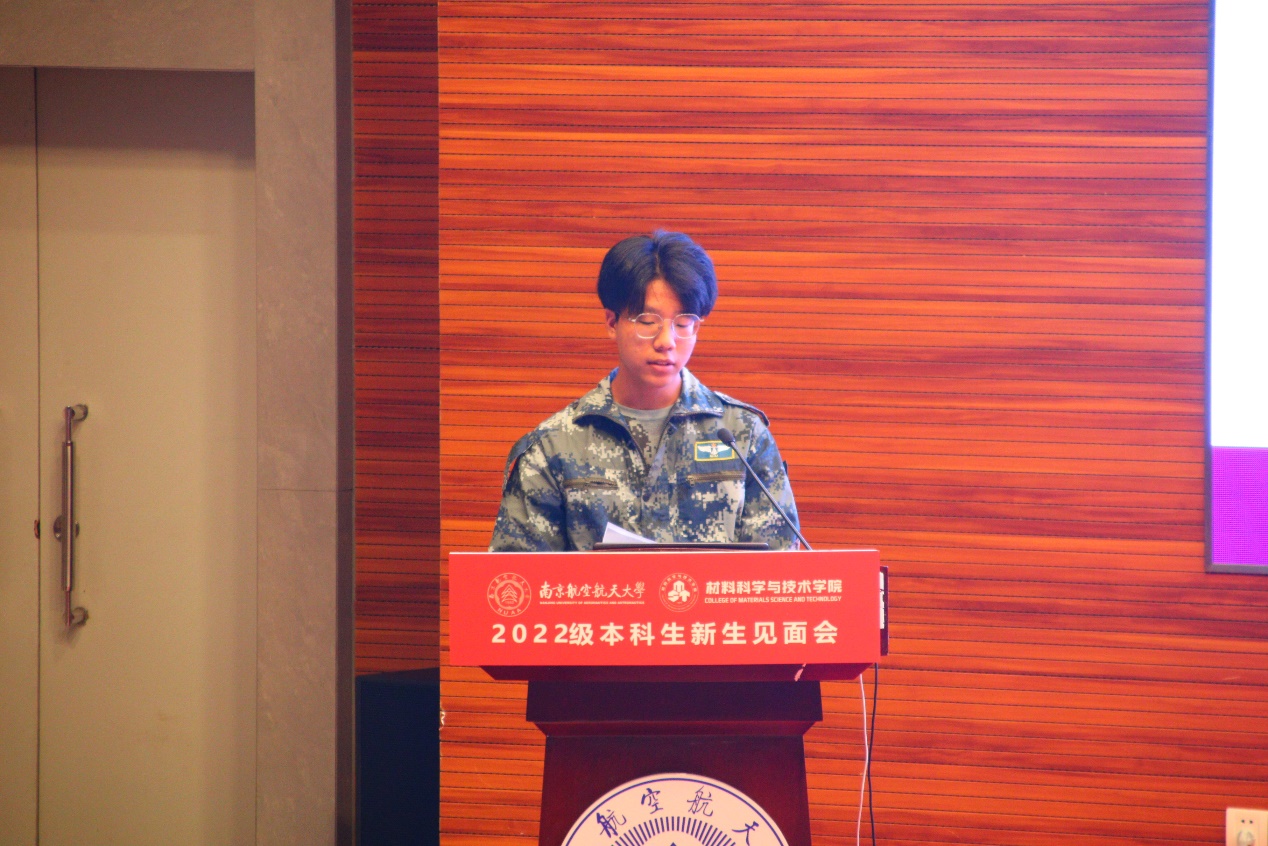 新生代表李海鑫表达了对南航、对成为南航材料学子的憧憬,未来也将承载着亲人的期许,在学途中不断提高自己,在生活中不断丰富自己,在实践中不断磨砺自己。