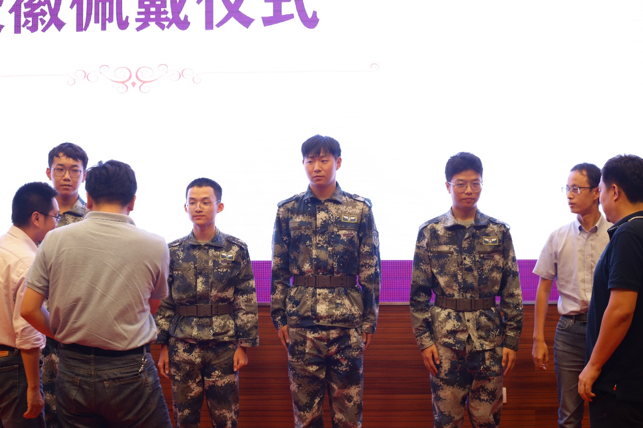 与会老师为新生代表佩戴南航校徽,台下全体新生共同佩戴校徽,正式宣告自己成为一名真正的南航人。