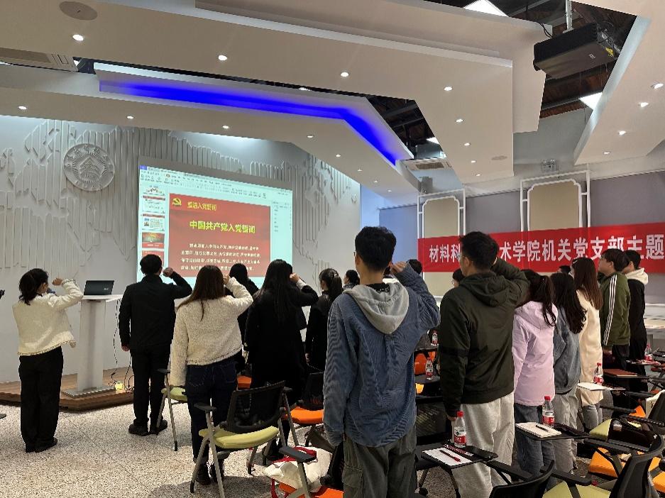 最后,学院机关党支部支部书记彭恬带领全体师生重温入党誓词。