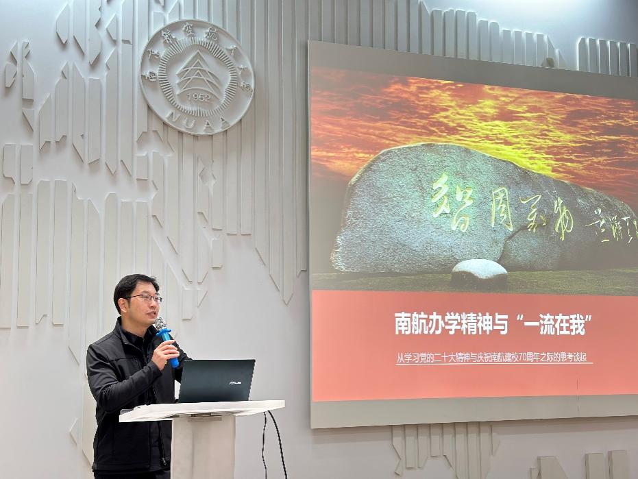 参观结束,学院党委书记石勇作了题为“南航办学精神与‘一流在我’”的专题党课。党课内容围绕“负重奋进,志在超越的办学精神”“敢为人先,与时俱进的改革进程”“只争朝夕,一流在我的实践担当”三个方面展开,讲述了几代南航人表现出来的精神特质,南航发展中形成的特色文化,感受到“南航速度、南航高度、南航温度”。最后,针对“一流在我”向全体参会成员提出六个维度的“思考题”,鼓励师生做到“四个提升”,即提升战略思维、系统思维、开放思维、专业思维。他强调,学院机关党支部要激发队伍生机活力,勇担使命、守正创新,以自我革命精神坚定不移推进机关党建高质量发展。