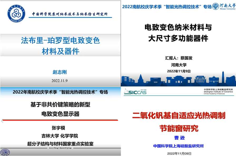 国家优秀青年基金获得者河南大学蔡国发教授做了题为“电致变色纳米材料与大尺寸多功能器件”的报告,围绕离子和电子输运过程的精确调控,从高质量半导体电致变色材料、大尺寸电致变色器件和多功能变色器件体系来进行详细讲述。国家高层次青年人才吉林大学张宇模教授做了题为“基于非共价键策略的新型电致变色显示器”的报告,围绕有机电致变色材料双稳性的问题,通过引入氢键、动态配位键等非共价键策略调整其电化学稳定性,开发了多种新型电致变色材料,实现了双稳多彩电致变色显示器的构筑。国家高层次青年人才中科院上海硅酸盐研究所的曹逊研究员做了“二氧化钒基自适应光热调制节能窗的研究”,围绕VO2基智能窗的问题,介绍了VO2自卷曲结构多级太阳能调控的最新进展,实现了VO2基智能窗高可见光透过率与高太阳光调节率的平衡。