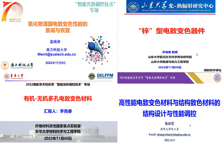 国家海外优秀青年基金获得者南方科技大学温瑞涛教授做了题为“氧化物薄膜电致变色性能的衰减与恢复”的报告,从离子俘获与反俘获角度,详细解释了其氧化物薄膜电致变色性能的衰减和恢复的原因与机制。山东大学“齐鲁青年学者”李海增教授做了题为“锌型电致变色器件”的报告,从锌负极以及高性能电致变色墨水的开发,详细介绍了该团队在多功能“锌”型电致变色器件的最新研究。国家海外优秀青年基金获得者东华大学李克睿教授做了题为“有机-无机多孔电致变色材料”的报告,围绕孔的调控,详细介绍了该团队在有机-无机多孔电致变色材料设计以及高性能器件构筑方面的研究工作。国家高层次青年人才清华大学张如范教授做了题为“高质量电致变色材料与结构致色材料的结构设计与性能调控”的报告,通过多级纳米结构设计,构建了一系列高质量电致变色材料,并详细介绍了有关碳管纤维结构致色方面的最新研究进展。