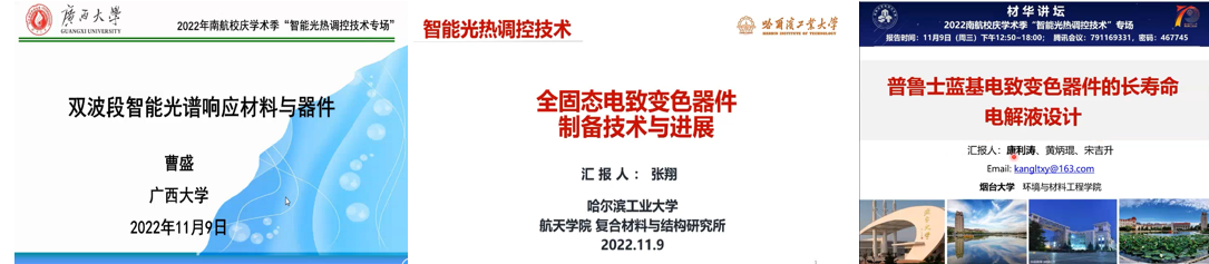 广西大学曹盛副教授、哈尔滨工业大学张翔副教授以及烟台大学康利涛副教授也别做了题为“双波段智能光谱响应材料与器件”、“全固态电致变色器件制备技术与进展”、“普鲁士蓝基电致变色器件的长寿命电解液设计”的报告,分享了在各自研究领域最新的研究成果与进展。