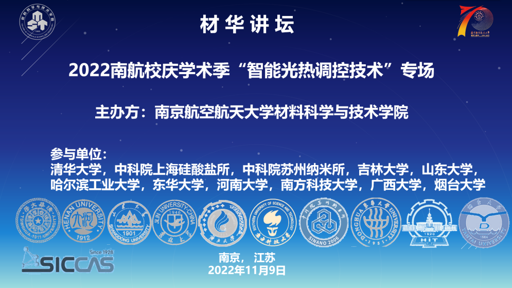 为了进一步贯彻落实党的二十大提出的实施科教兴国战略,庆祝南航建校70周年华诞,促进学术交流,提升学术影响力和育人成效,助力学校“双一流”建设,11月9日,jojo漫画 举办2022南航校庆学术季“智能光热调控技术”专场学术交流活动。中科院苏州纳米所研究员赵志刚、河南大学教授蔡国发、吉林大学教授张宇模、中科院上海硅酸盐所研究员曹逊、南方科技大学教授温瑞涛、山东大学教授李海增、东华大学教授李克睿、清华大学教授张如范、广西大学副教授曹盛、哈尔滨工业大学副教授张翔和烟台大学副教授康利涛等专家学者参加本次线上会议。学院院长张校刚教授参会并致辞,一百余名南航师生在线聆听报告并参加讨论。会议由学院材料科学系副主任张圣亮主持。