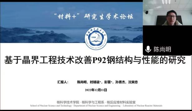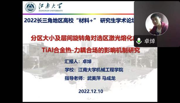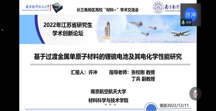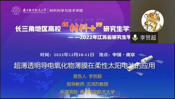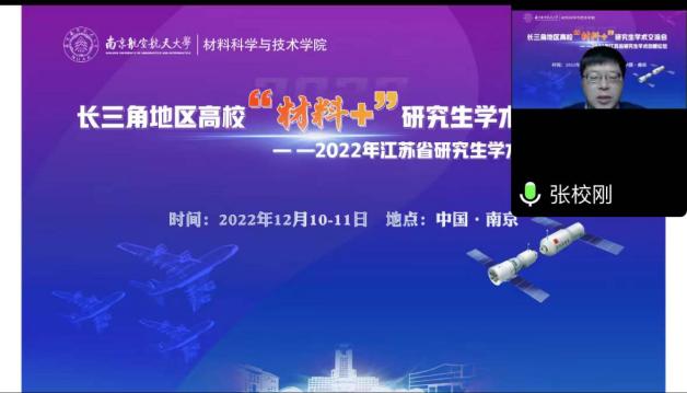 12月10-11日,由江苏省教育厅工学 3 类教指委主办,南航jojo漫画 承办的长三角地区高校“材料+”研究生学术交流会暨2022年江苏省研究生学术创新论坛活动顺利举办。来自北京大学、浙江大学、北京航空航天大学、上海理工大学、东南大学、西北工业大学、南京理工大学、中国科学院等十几所高校的40余名学生通过线上的形式进行学术成果交流与分享,百余名师生聆听报告并参加讨论。