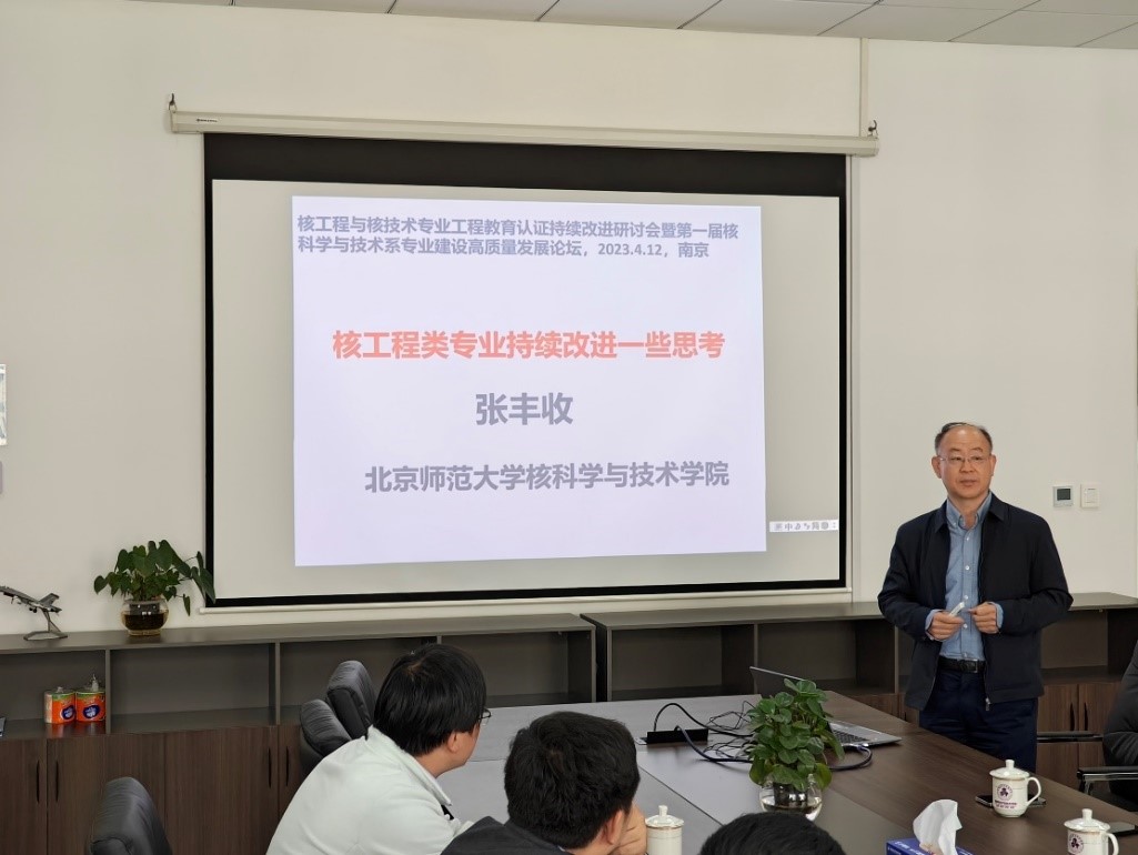为了推动工程教育认证持续改进工作高质量内涵式发展,促进核工程与核技术专业人才培养质量不断提升,4月12日上午,jojo漫画 组织召开核工程与核技术专业工程教育认证持续改进研讨会,邀请教育部高等学校教指委核工程类专业教学指导委员会副秘书长、北京师范大学核科学与技术学院张丰收教授出席会议并作主题报告,会议由副院长陶海军主持,材料加工系副主任李斌斌、核科学与技术系副主任龚频、主任助理何庆华及部分教师代表参加会议。