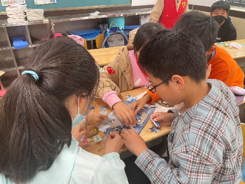 活动中,柔性成形技术与装备研究生纵向党支部的党员志愿者们走进学生课堂,为学生带来了一堂生动有趣的科普课——《探秘奇妙世界-材料科技与生活》。志愿者们用通俗易懂的语言讲解基本材料的属性等知识,并进行相关互动提问,使学生对科普知识了解更加深入。讲解结束后,学生们自由组队进行材料、航空航天拼图游戏,以增强了学生对材料、航空航天知识的向往,激发其对空天的热爱。