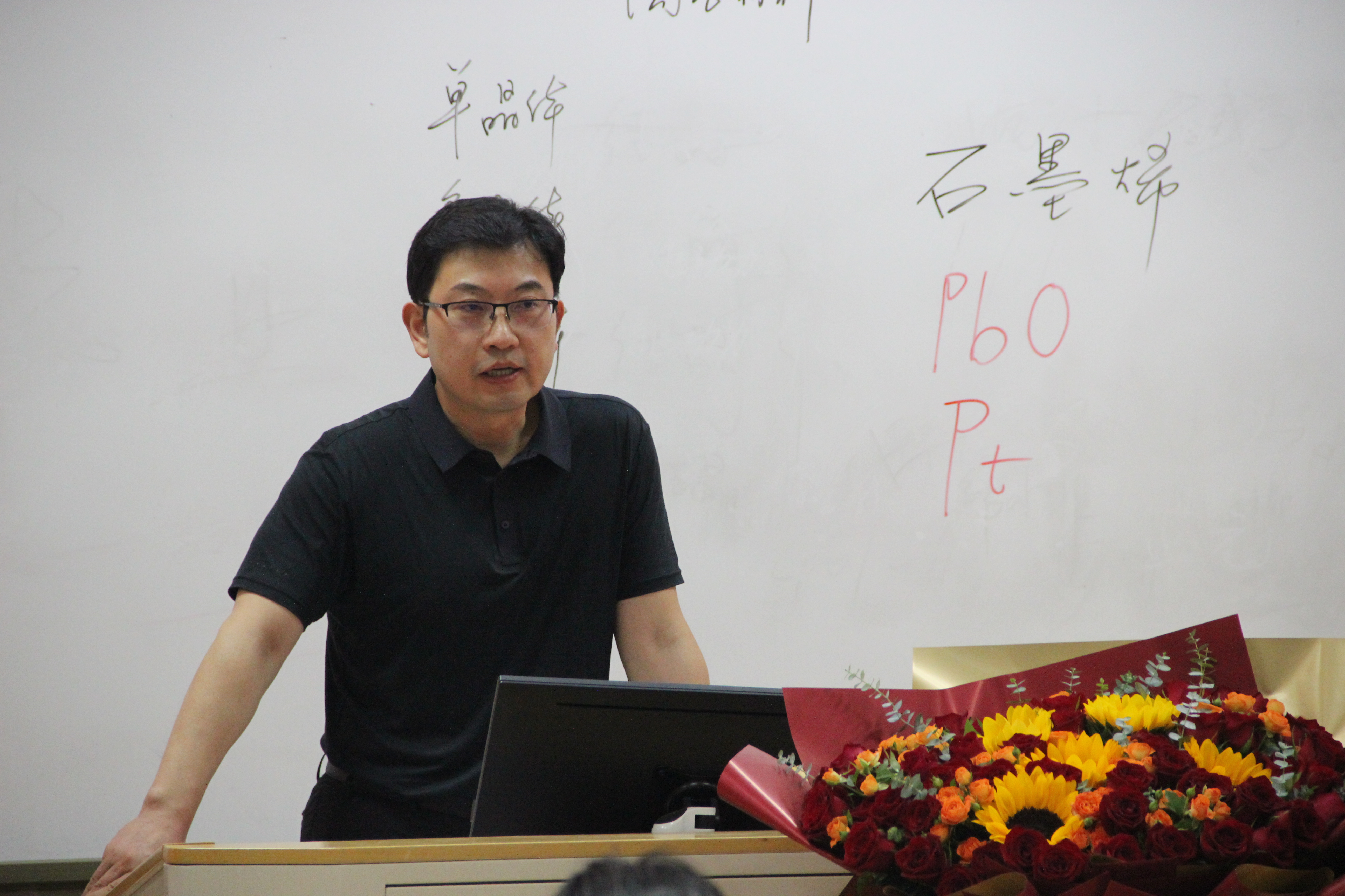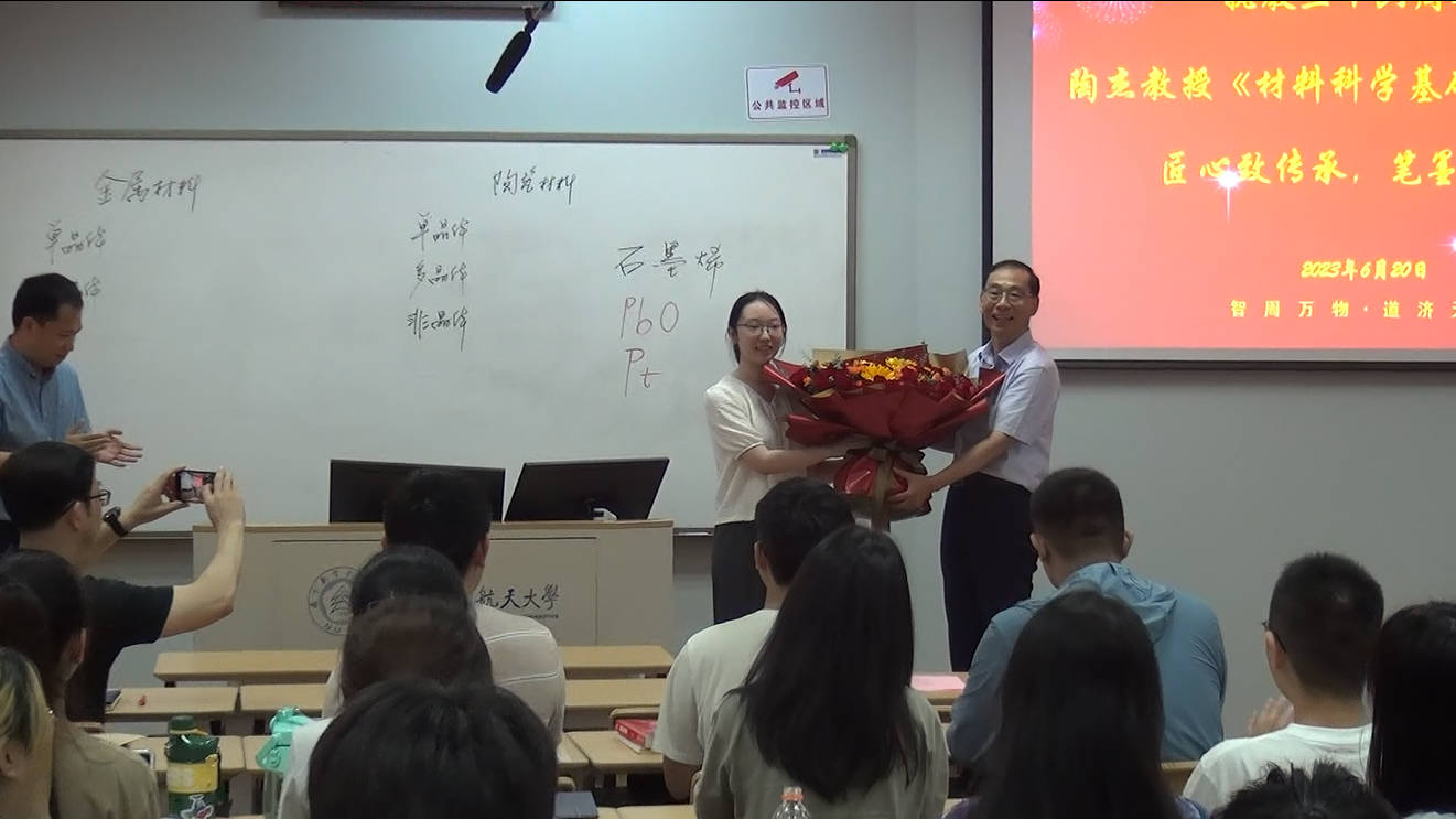下课铃声响起,学生代表杨馥娜为陶杰教授献上鲜花,以此表达对陶老师的尊敬与不舍之情。她深有感触的说:“陶老师在学生眼里一直是一位平易近人的好老师,会关心同学们生活的方方面面。”她回忆道,在师生座谈会上陶老师认真听取每一位学生提的建议,并带领教学团队在教学过程中不断改进完善,听陶老师的《材料科学基础》课程终生受用,也让自己对专业学习坚定了信心。