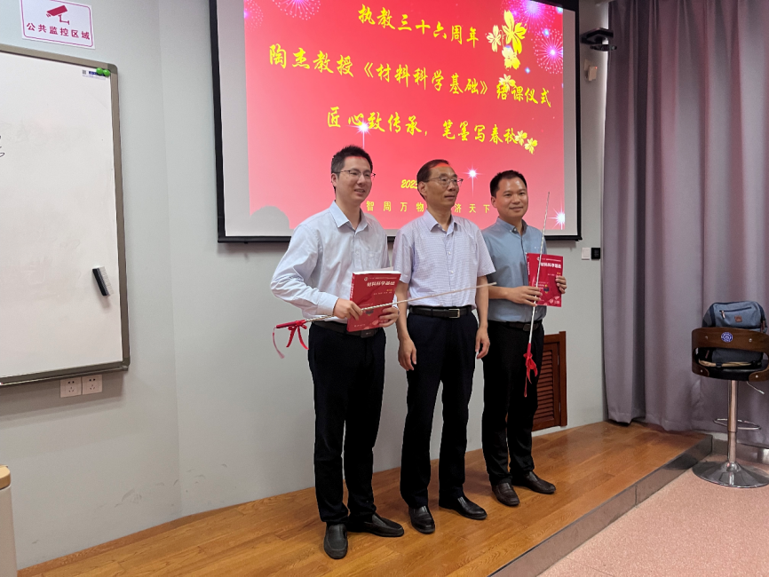 同时,陶杰教授将教鞭以及《材料科学基础》课本传递给沈一洲、程诚两位课程青年任教教师,以此为象征,传承36年来潜心研学、教书育人的精神和使命。