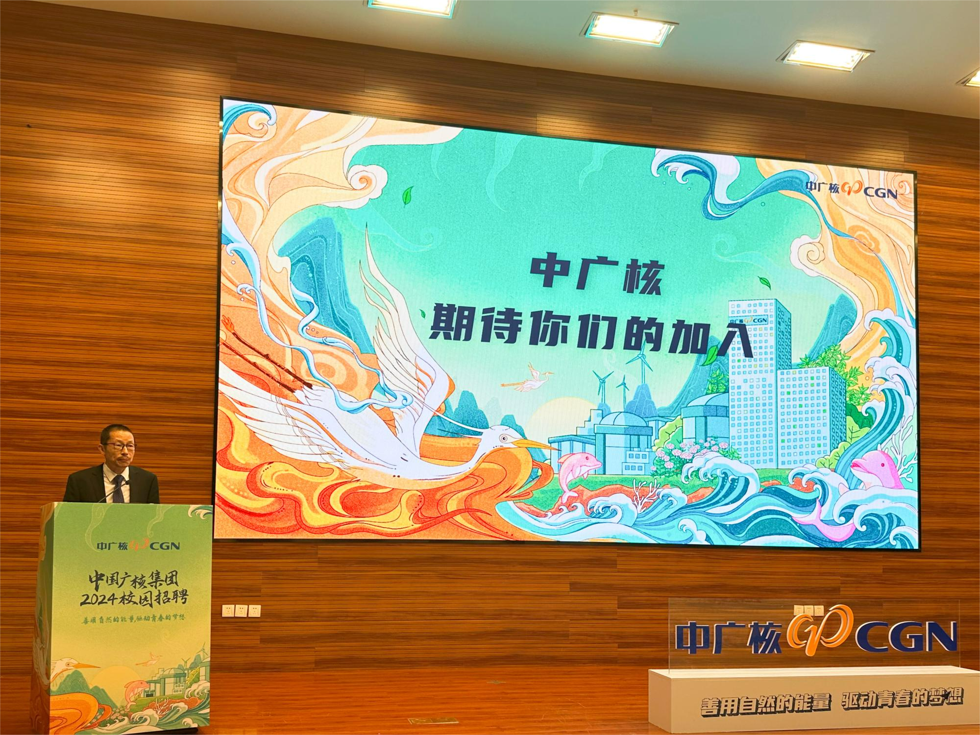中广核南京招聘组组长张福森详细介绍了集团的招聘行程、需求岗位和培养计划,并和同学们展开互动交流。
