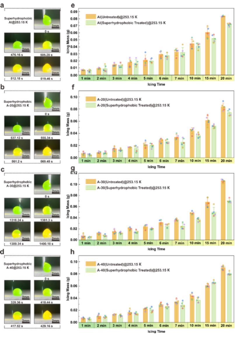 基于上述计算结果,将超疏水 A-30表面置于结冰风洞进行测试,结果显示表面积冰随来流方向逐渐降低,且10 min内的结冰质量较超疏水平板表面降低了40%以上。与超疏水平板表面相比,该试样表面在-20℃下仍可以观测到微小液滴的撞击弹离行为。考虑到微小液滴的运动行为主要由气流控制,受惯性和重力的影响较小,可以认为平板表面近壁面的低速流场难以提供液滴弹离表面的驱动力,而结构内部存在的微型涡旋则有助于液滴的脱离。因此,该研究团队认为,结构表面因结构气动特征引发的上升气流和超疏水微纳结构提供的液滴自驱离效应共同降低了超疏水表面的结冰概率。此外,具有特定角度的低能微结构表面可以有效延缓结冰形核过程,为微小液滴的弹离提供了更多的时间。