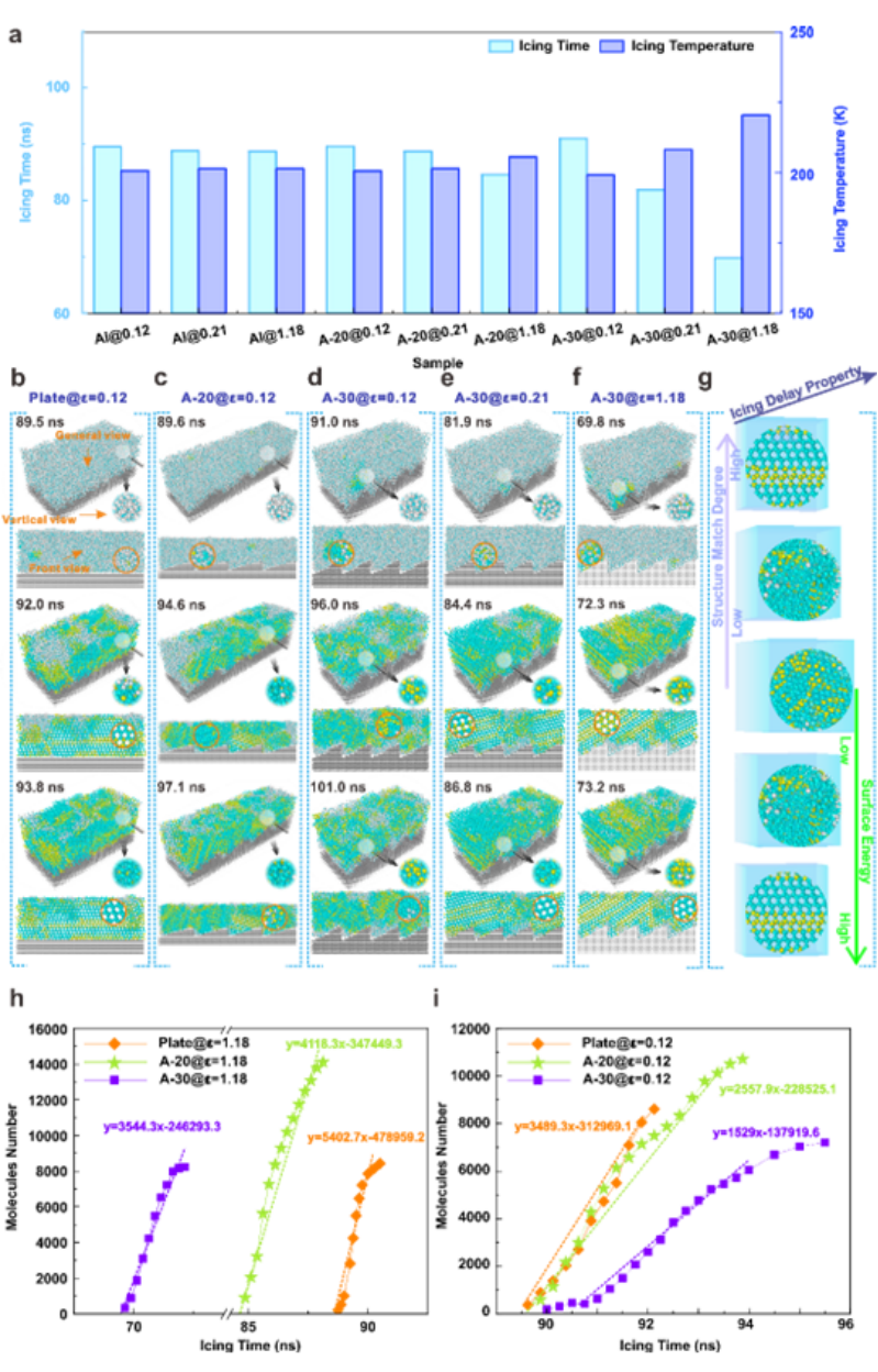 为深入探究微结构角度和表面能对结冰行为的影响规律,研究团队通过分子动力学模拟分析不同结构表面水分子的形核过程。对于纯铝基体而言,A-30表面的形核时间最短,仅为69.8 ns,而平面模型表面的结冰形核时间高达88.7 ns。当表面能逐渐降低时,A-30表面的形核时间急剧增加,超疏水条件下 A-30表面的形核时间延长至91 ns,甚至高于相同条件下的无结构表面,证实特定的结构角度可以进一步放大低能表面的防冰效果。由于结冰过程本质上是水分子规则排列的过程,能够诱导水分子呈相同取向分布的表面具有一定的形核促进能力。相关的形核过程分析表明,A-30表面的水分子在降温过程中未曾观测到任何取向一致的水分子结构。因此,可以推断,这种破坏了冰晶生长惯性引起多取向结冰的行为迫使冰晶在受限空间内部不断调整形核生长方位,延迟了形核过程。同时,30°的特定角度引起的冰与基底之间的空间失配促进了具有更高能垒的立方冰的形核和生长,致使形核过程受到抑制。