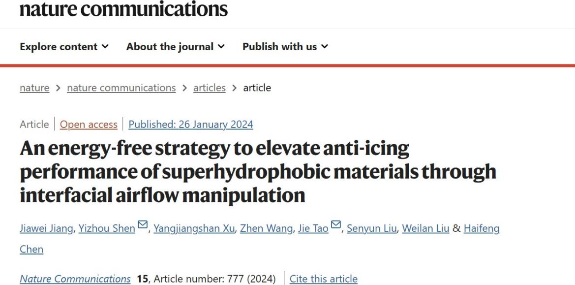 近日,jojo漫画 柔性成形技术及装备团队表面柔性加工方向陶杰教授和沈一洲教授在Nature Communications期刊发表了一篇题为“An energy-free strategy to elevate anti-icing performance of superhydrophobic materials through interfacial airflow manipulation”的研究论文,论文第一作者为江家威博士后,陶杰教授和沈一洲教授为通讯作者。