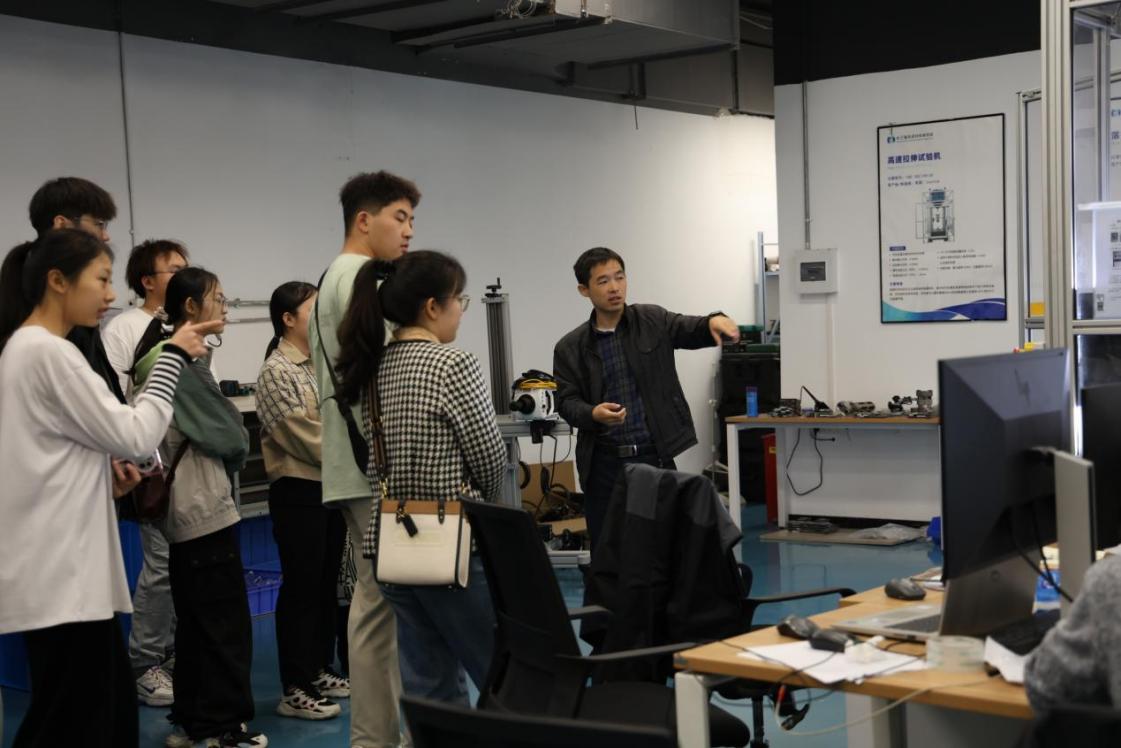 从物化性能测试设备到显微组织表征设备再到力学性能测试设备,老师为同学们详细介绍了仪器的作用原理和使用场景。在沟通交流中,同学们了解到目前高精密仪器依旧主要依赖进口,激发了同学们未来为祖国科研事业做贡献的决心。