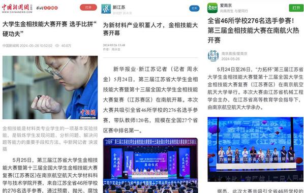 jojo漫画 高度重视此次大赛的承办工作。大赛筹备期间,jojo漫画 多次召开专题会议对大赛各项工作进行周密部署和细致安排,学院党委书记石勇、院长顾冬冬亲临现场检查实验设备、场地布置等情况。各部门成立专项工作小组,统筹推进大赛各项工作安排,分工明确,配合默契,各项工作均精心组织、严密实施,确保大赛的顺利进行。比赛期间,专门组织了对御风园航空航天教育基地、航天馆、安全教育体验馆、校析测试中心、材料学院创新实验室等多个校内教育教学实践育人场所的参观,充分发挥“比赛、科技、文化”的叠加效应,实现创新实践与课程思政的有机结合,不断提高材料科学的发展空间和创新动力。本次金相技能大赛获中国新闻网、中国江苏网、现代+、南京晨报等主流媒体报道10余次,获广泛关注。大赛的成功举办,增进了省内兄弟院校之间的交流和友谊,以实际行动实现了“以赛促教、以赛促改、以赛促学”的目标,也培养了学生精益求精的工匠精神,对进一步深化教育教学改革、创新人才培养模式、提振材料类专业学生专业自信心具有重要意义。