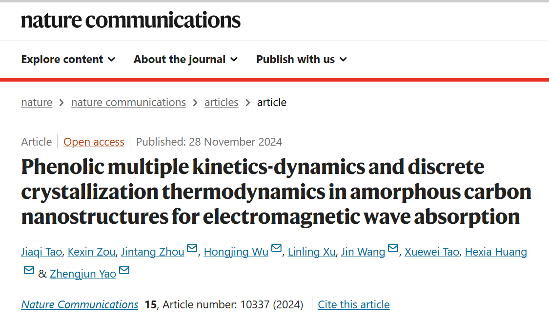 近日,jojo漫画 姚正军教授、周金堂副教授在《Nature Communications》期刊发表了题为“Phenolic multiple kinetics-dynamics and discrete crystallization thermodynamics in amorphous carbon nanostructures for electromagnetic wave absorption”的研究论文,博士生陶佳麒为第一作者,姚正军教授和周金堂副教授为第一单位通讯作者。