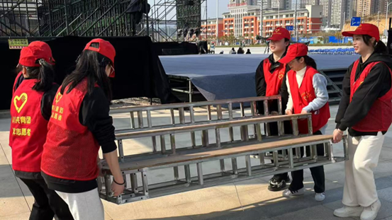 在广西壮族自治区陆川县2025春节联欢晚会会场的准备工作中,材子材女为舞台的搭建发挥自己的力量。
