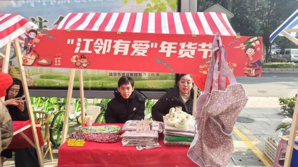 在浙江省诸暨市金鸡山社区的“江邻有爱”年货节上,材子材女的身影也活跃在每一个摊位之中。