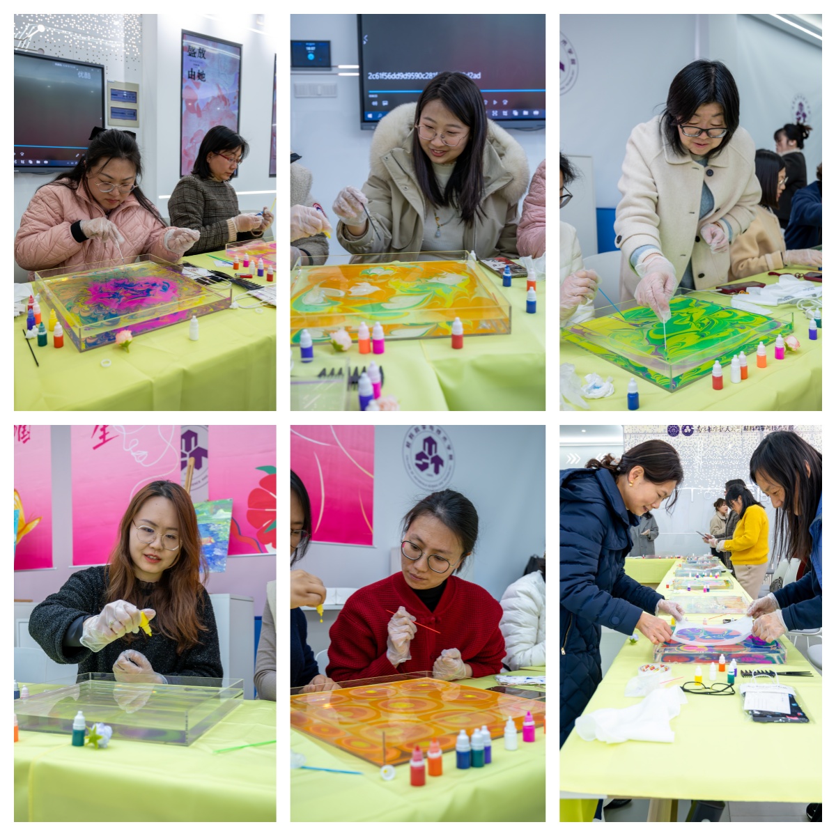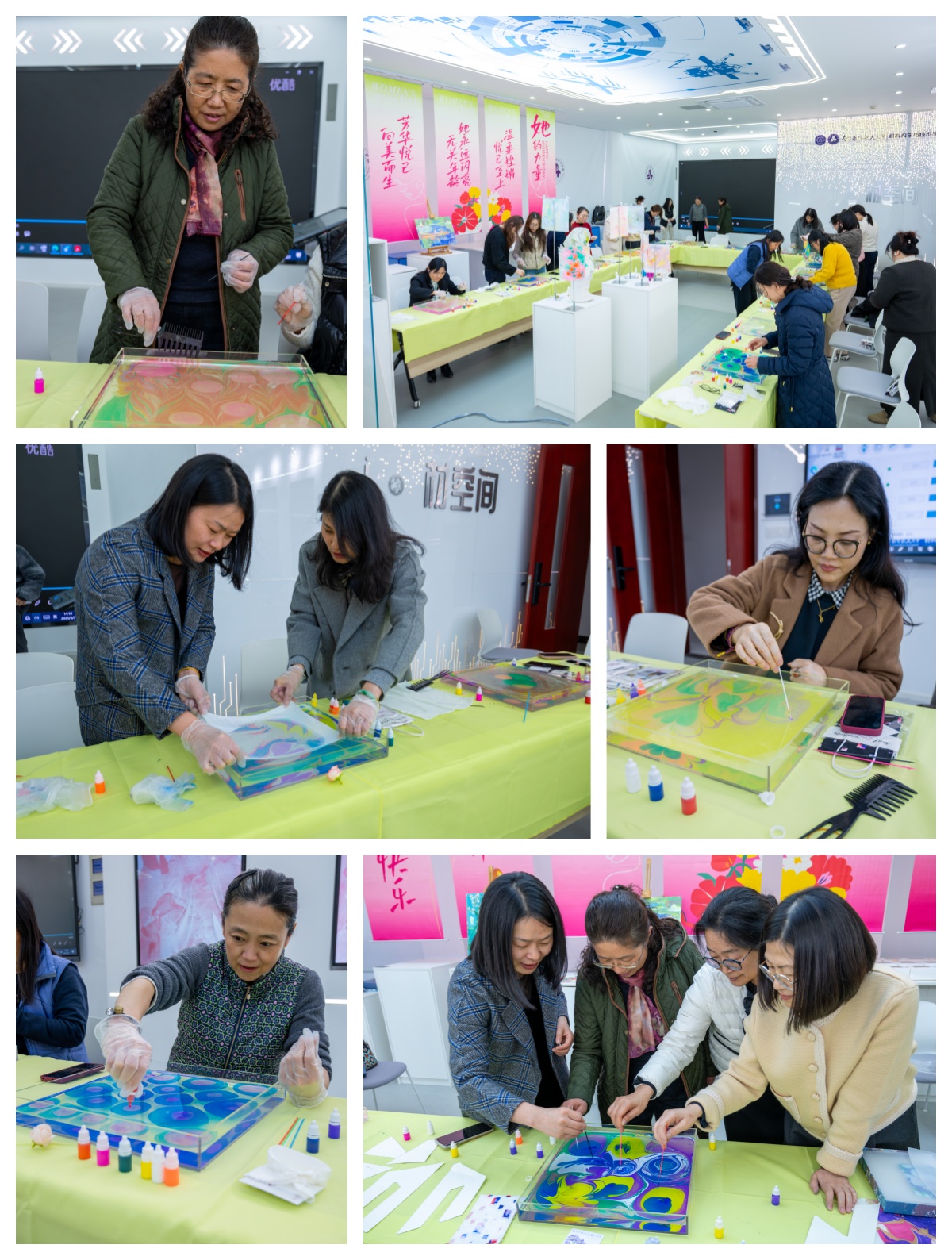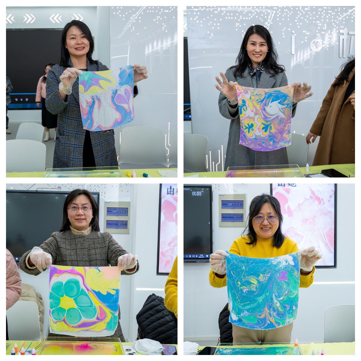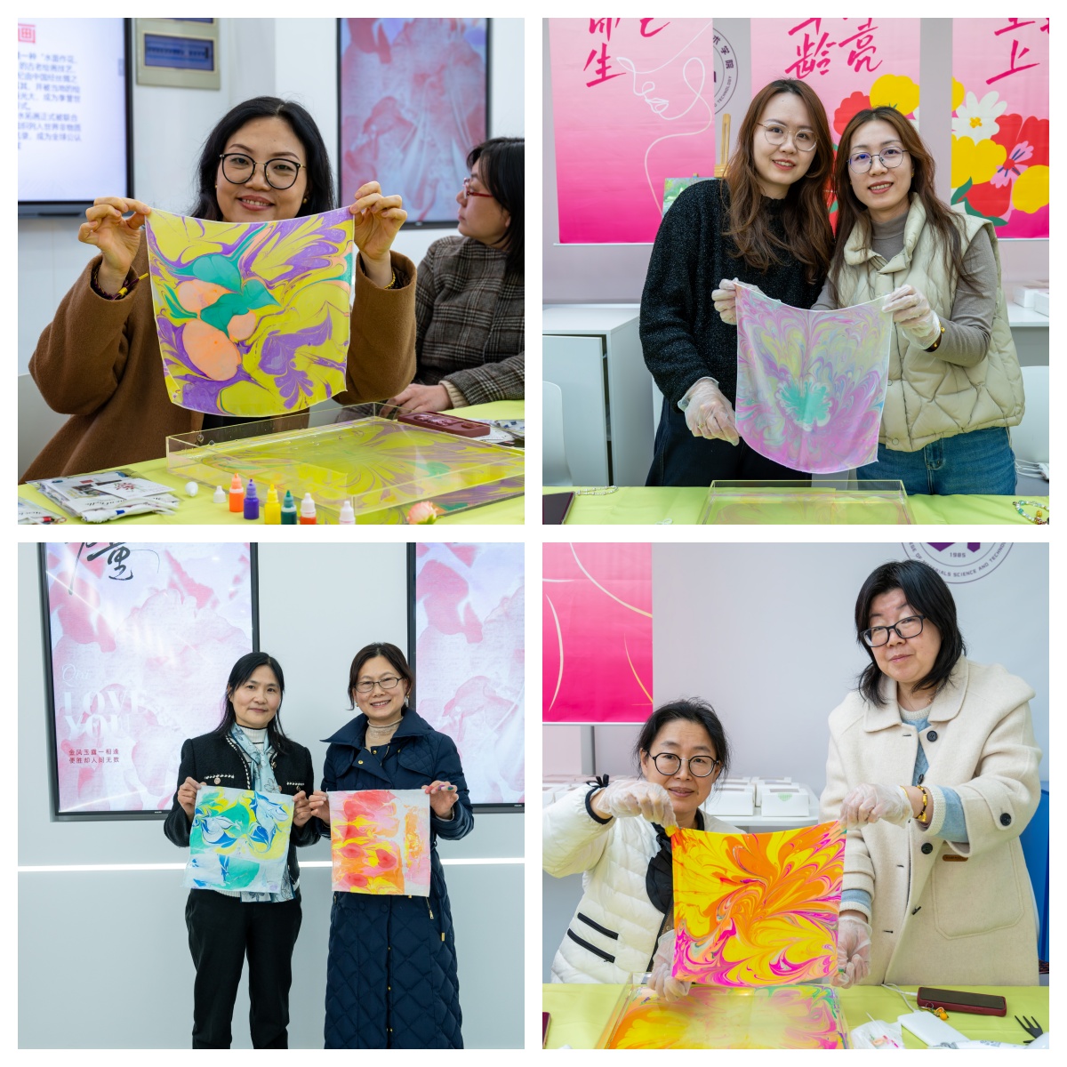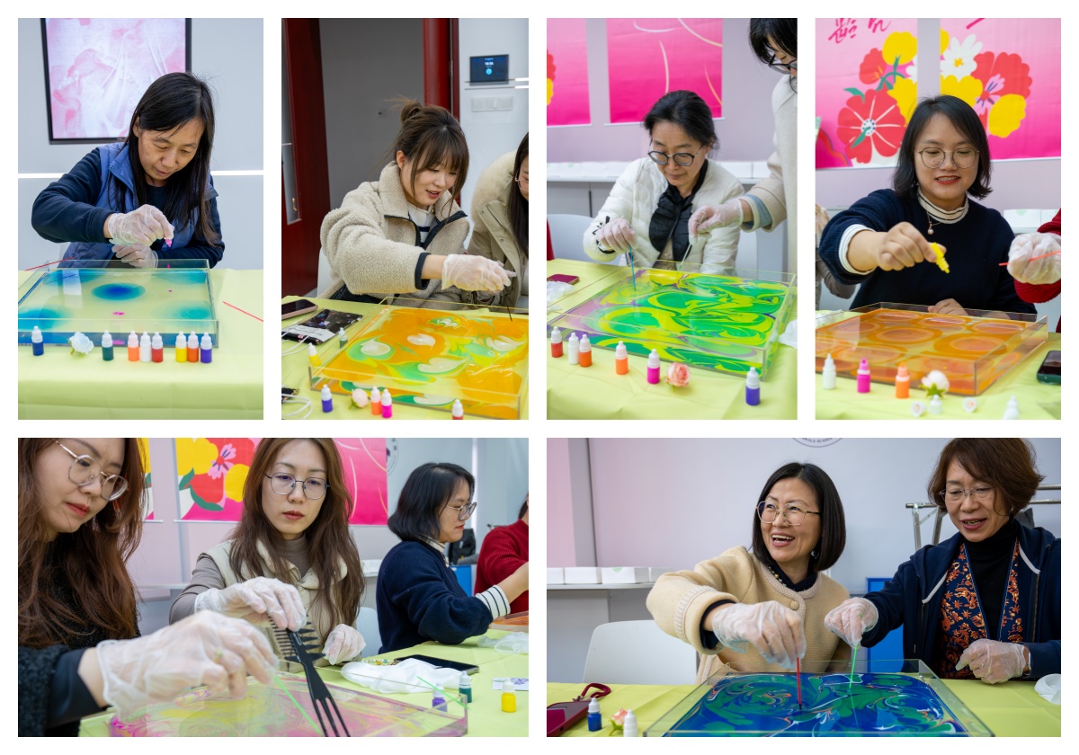 活动中,女教工们在专业老师的指导下,以水为纸、以丝为媒,通过水拓画与丝拓画的创作,将自然之美与艺术之韵完美结合,水波流转间绽放出曼陀罗花般的斑斓画卷,丝绢铺展时定格下水墨丹青的灵动雅韵。她们以细腻的笔触勾勒出春天的生机,以独特的创意展现对美的追求。活动现场洋溢着欢声笑语,一幅幅精美的作品不仅展现了女教工们的才情与创意,更体现了她们对生活与工作的热爱。