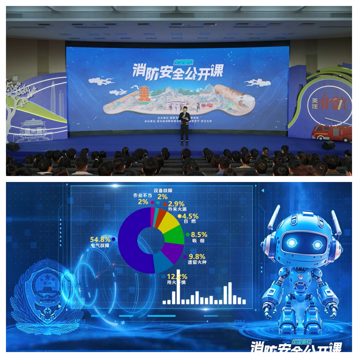 本次以武汉大学为主会场的公开课,创造性运用实景模拟、三维数字孪生、人机交互等前沿技术,构建起"场景浸润+智能交互"的教育新范式。课程中,虚拟教官“蓝博特”带领师生“云探访”宿舍火灾现场,通过3D动态演示直观揭示有毒烟气扩散路径及致命危害。人形机器人、智能机器狗等设备的亮相,更以趣味互动形式强化知识记忆,激发学生学习主动性。jojo漫画 师生纷纷表示:“数字化场景让书本上的平面知识变成了立体可感的生存技能,这种学习体验令人耳目难忘。”
