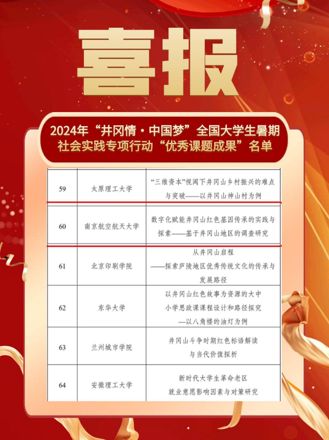 近日,2024年“井冈情·中国梦”全国大学生暑期社会实践专项行动优秀课题成果遴选结果揭晓jojo漫画 “恰少年风华正茂”井冈山精神宣讲团撰写的实践课题“数字化赋能井冈山红色基因传承的实践与探索”成功入选“优秀课题成果”!