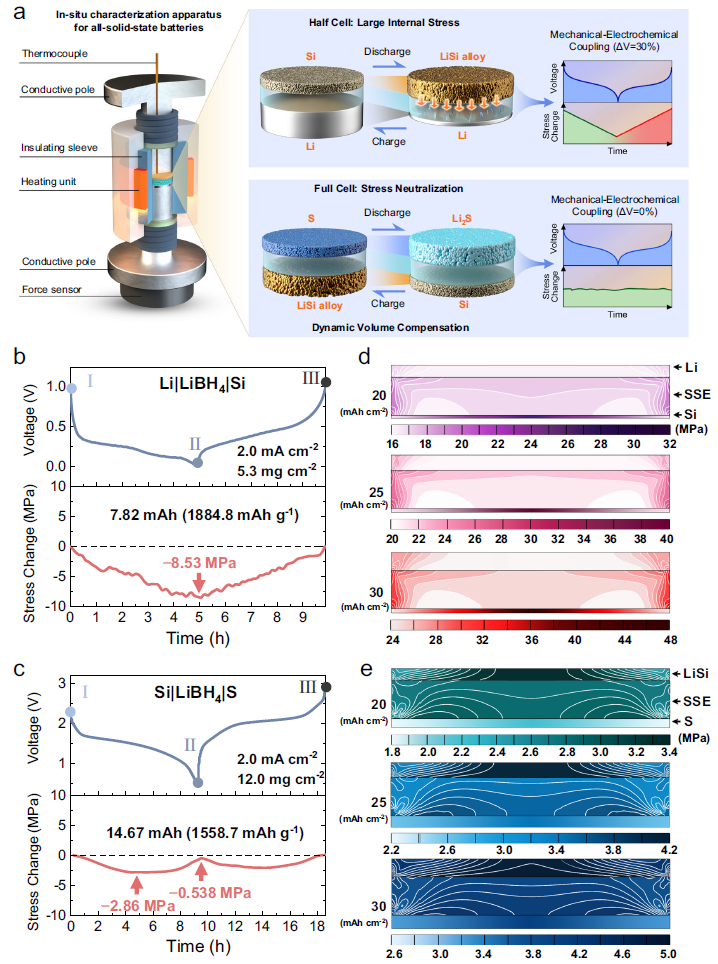 通过原位应力监测(宁波创锂提供)结合有限元模拟验证揭示了锂硅半电池与硅硫全电池的应力演化规律,表明硅硫全电池的结构设计起到了更好的应力中和作用。