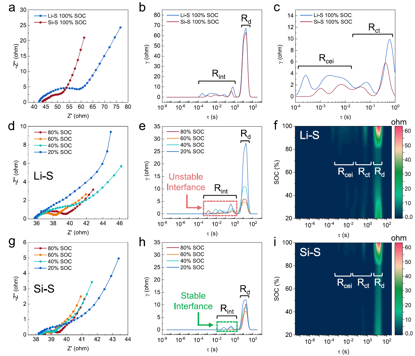通过电化学阻抗谱(EIS)与弛豫时间分布(DRT)分析揭示了动态体积补偿对反应动力学的优化机制。相较于锂硫半电池,硅硫全电池界面阻抗降低归因于动态补偿策略维持了电极-固态电解质的紧密接触。动态补偿有效缓解了体积变化对界面的机械冲击,为高倍率与长循环性能提供了动力学保障。