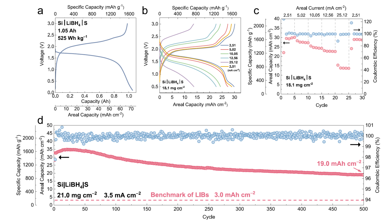 图3展示了应力中和状态下的硅硫全电池电化学性能突破,实现了高负载、高面容量下的高比能(525 Wh kg−1)。倍率性能测试中,在25.12 mA cm−2的极速充放电下,稳定释放13.6 mAh cm−2容量且无短路风险。长循环测试中,500次循环保持高稳定性。