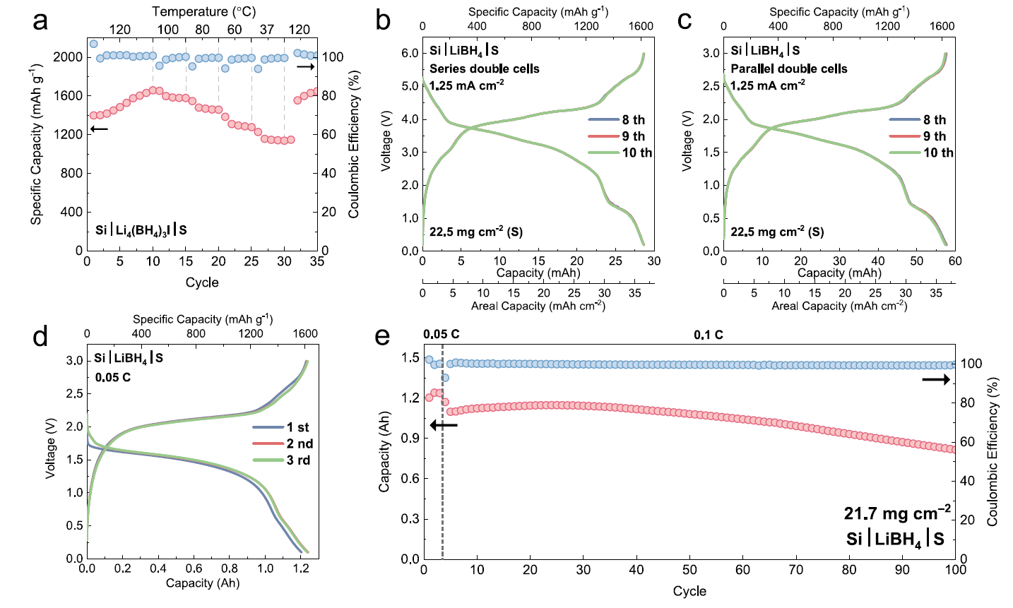 图5 Si−S电池的宽温域性能、电池组设计及Ah级电芯