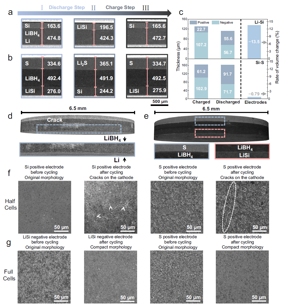 为了揭示了动态体积补偿策略的核心机制,通过原位X射线显微CT技术和SEM表征将电化学过程中的体积变化可视化,结果显示电极-电解质界面紧密接触且无裂纹生成,证实动态补偿设计可有效消除应力异质性,维持结构稳定。该结果直观表明动态体积补偿策略通过协同正负极体积变化,有效抑制应力集中导致的微观结构损伤。