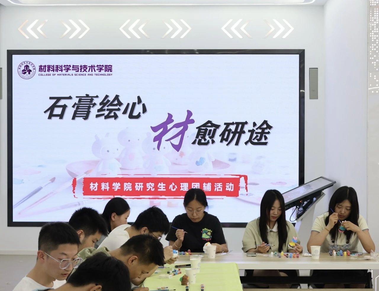 为丰富校园文化生活,缓解研究生科研压力,促进心理健康发展,材料学院于5月19日举办了“石膏绘心,‘材’愈研途”心理团辅活动。校心理中心老师陈瑜、学院研究生辅导员及30余名研究生共同参与本次活动。