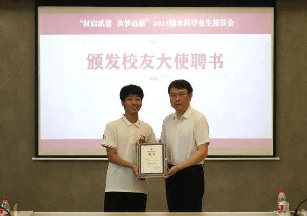 为了加强校友与母校之间的联系,促进校友间的沟通交流,学校在每个学院中选聘了一名优秀的毕业生担任校友联络大使。顾冬冬为2025届本科生李剑超同学颁发校友大使聘书。