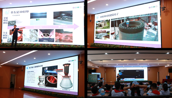 随后,林开杰老师以3D打印为切入点展开“3D打印 飞向太空”主题科普。科普从“什么是3D打印”这一基础概念切入,将复杂的制造工艺与全麦面包制作对比,让小朋友们轻松理解增材制造原理。在讲解过程中,各式各样的3D打印样例引发了小朋友们的阵阵惊叹。围绕航空航天应用主题,重点介绍了3D打印技术在火箭发动机、卫星部件等关键领域的创新应用。特别是展示太空3D打印案例时,小朋友们对“在太空打印工具”的概念表现出极大兴趣,现场互动气氛热烈。
