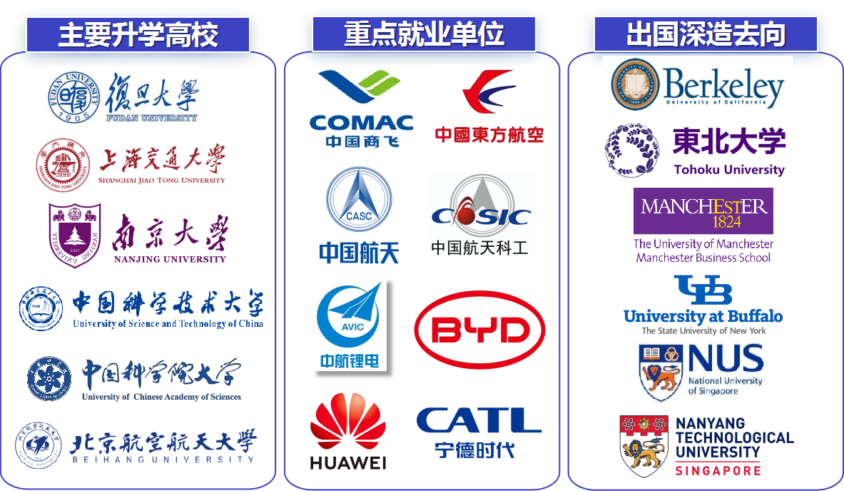 近三年本科平均升学率为54.08%。主要进入“双一流”建设高校和QS世界百强名校深造。近年来已向中国商飞、东方航空、华为、中兴通讯、比亚迪等单位输送大批优秀毕业生。近三年专业本科生就业率(含升学)接近100%,人才培养质量获得社会广泛认可。