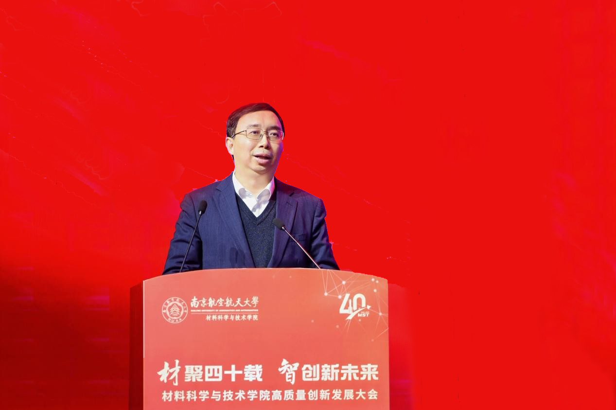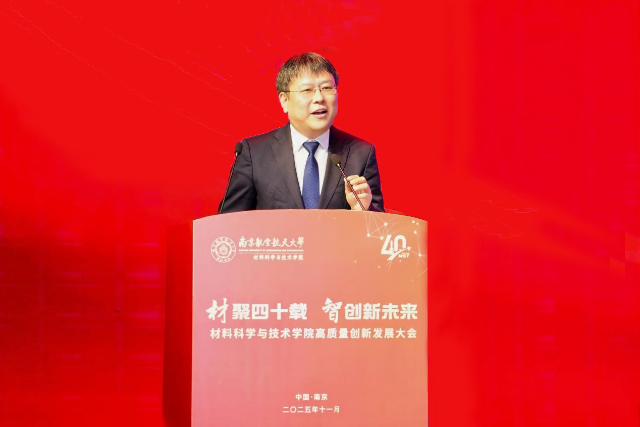 姜斌代表学校向为材料学院发展倾注心血的老领导、老教师、老同志们致以最崇高敬意,向长期以来关心支持学院发展的社会各界朋友表示衷心感谢。他指出,学院自1985年创立以来,始终秉承“航空报国、贡献国防”的传统,涵养“材料强国、材料报国”的使命担当,深耕于航空航天与国防现代化的沃土,走出了一条特色鲜明、成果丰硕的创新发展之路。面向未来,期待学院坚持党建领航,筑牢高质量发展的政治根基和组织保障,聚焦国家重大需求,持续优化学科布局、提升贡献能级,不断产出标志性成果,彰显南航材料担当;抢抓发展机遇,持续搭建高层次人才干事创业平台,厚植拔尖创新人才培养沃土,奋力建设航空、航天、民航特色鲜明的世界一流材料学院。