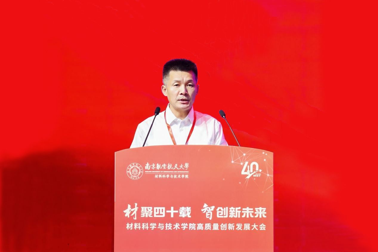 姜斌代表学校向为材料学院发展倾注心血的老领导、老教师、老同志们致以最崇高敬意,向长期以来关心支持学院发展的社会各界朋友表示衷心感谢。他指出,学院自1985年创立以来,始终秉承“航空报国、贡献国防”的传统,涵养“材料强国、材料报国”的使命担当,深耕于航空航天与国防现代化的沃土,走出了一条特色鲜明、成果丰硕的创新发展之路。面向未来,期待学院坚持党建领航,筑牢高质量发展的政治根基和组织保障,聚焦国家重大需求,持续优化学科布局、提升贡献能级,不断产出标志性成果,彰显南航材料担当;抢抓发展机遇,持续搭建高层次人才干事创业平台,厚植拔尖创新人才培养沃土,奋力建设航空、航天、民航特色鲜明的世界一流材料学院。