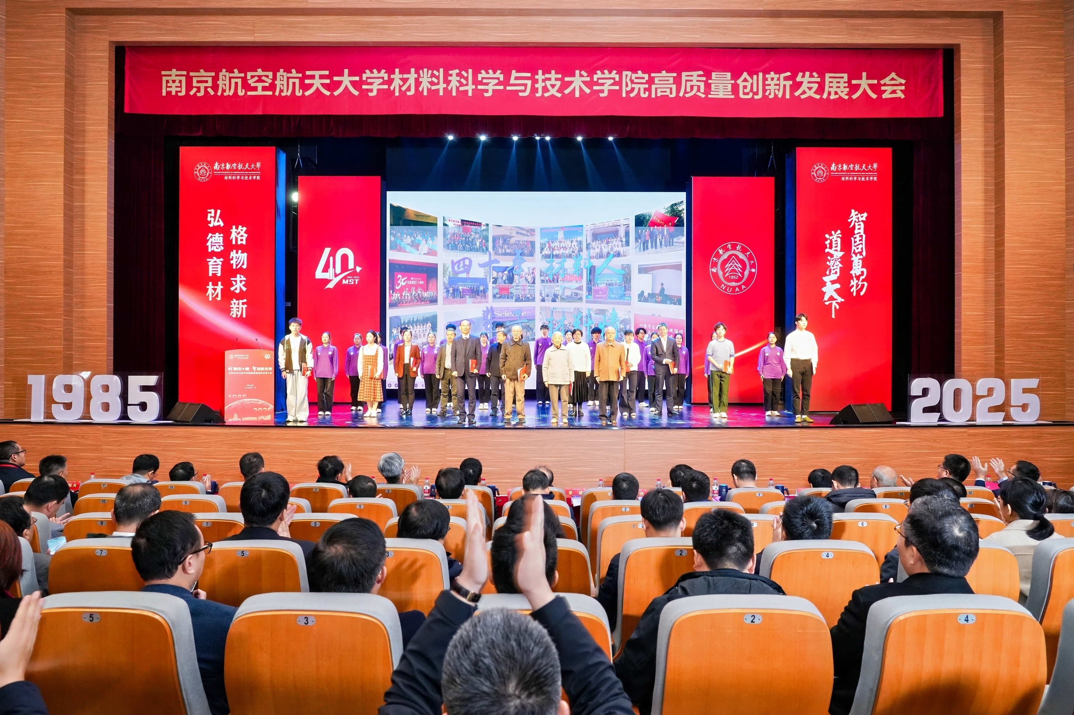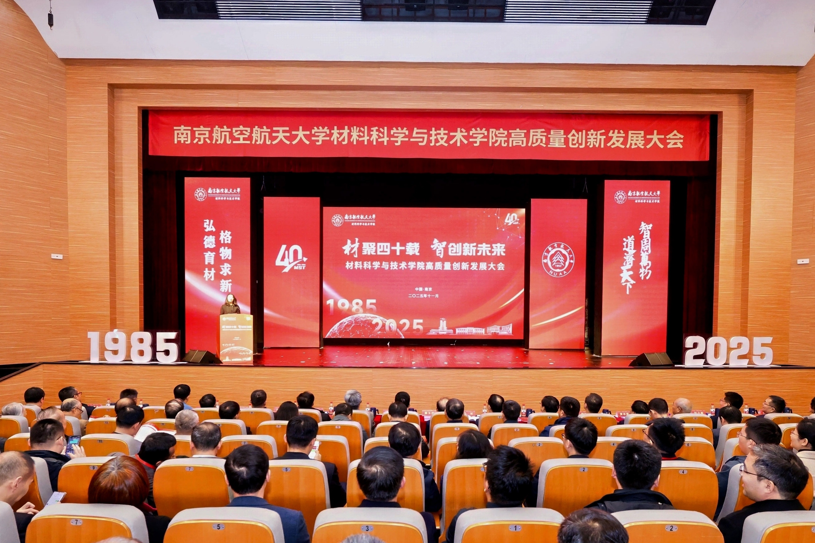 院长顾冬冬作学院发展报告,就学院四十年来的建设情况、发展成效以及未来展望进行汇报。砥砺深耕、守正创新,几代南航材料人始终坚持服务国家战略,围绕空天材料、成形加工、表面工程、能量存储、核技术应用等开展前沿研究,材料科学学科进入ESI全球前1‰,综合实力稳步提升。未来,学院将锚定学校2035年发展目标,聚焦“十年行动计划”,持续为航空航天、国防科技和产业创新贡献材料力量。